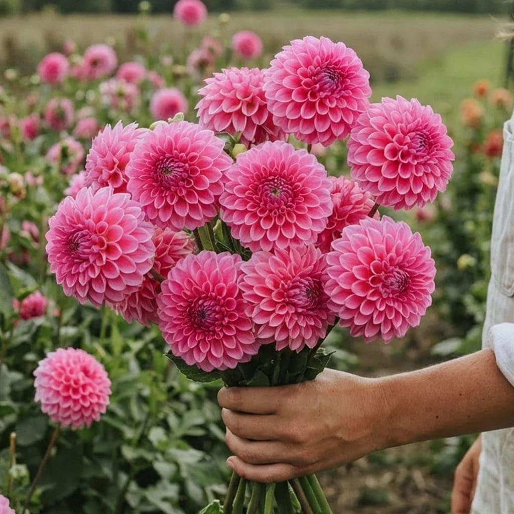 Le dahlia Sandra est une variété de dahlias balle remarquable pour ses charmantes fleurs roses compactes bordées de blanc.