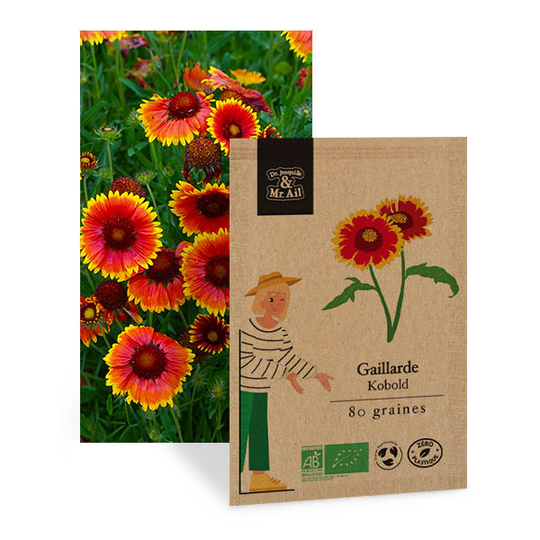 La gaillarde Kobold est un peu la star des parterres, des jardinières et des bouquets. Ses fleurs flamboyantes, bigarrées de rouge et de jaune, peuvent atteindre jusqu’à 30 cm de diamètre. Cette variété vivace à longue floraison est extrêmement facile d’entretien.Une fois coupée, elle conservera son intensité en vase pendant une longue période.